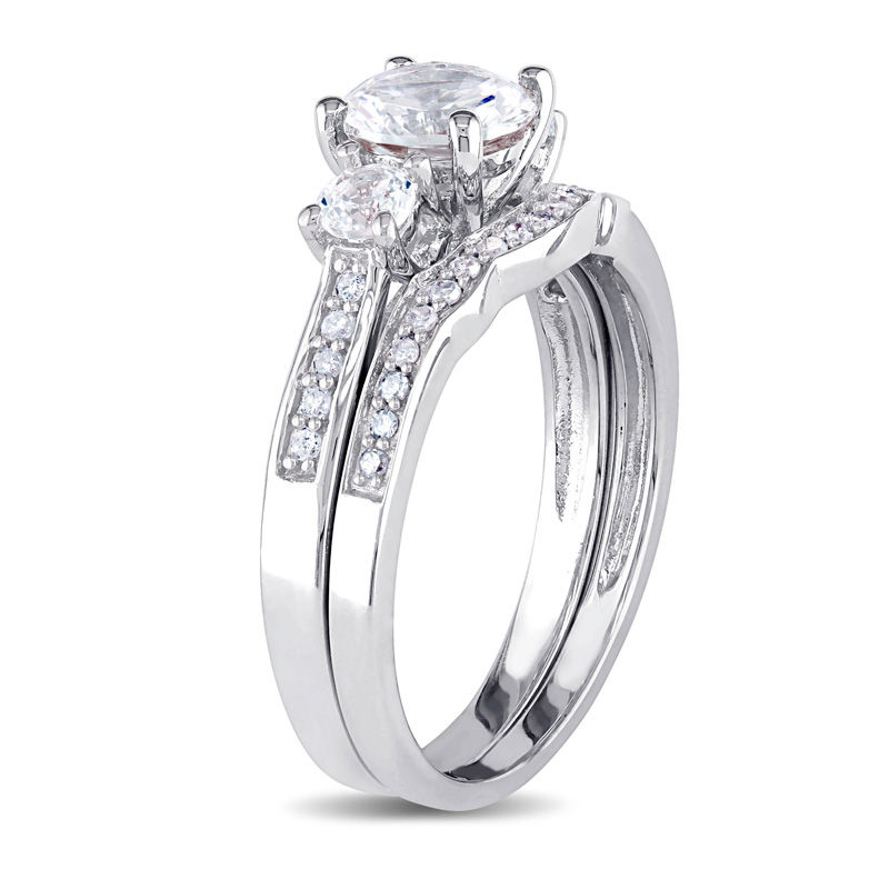 Simply stunning, this glistening bridal set is a beautiful beginning to the rest of your lives together. Shimmering in cool 10K white gold, the engagement ring features a dazzling 6.0mm white sapphire flanked by a pair of smaller created sapphires. Sparkling pav??-set diamonds adorn each side of the tapered shank for a look she can’t help but admire. On your special day, a coordinating contoured diamond-lined wedding band completes this significant expression of your love. Radiant with 1/8 ct. t.w. of diamonds and a brilliant buffed luster, this bridal set is everything she imagined and more.