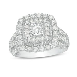 This resplendent engagement ring showcases a glamorous 3/4-carat princess-cut diamond framed in brilliant round diamonds. Three rows of round diamonds shimmer down the band, complemented by classic milgrain accents for a sophisticated look. The ring is styled in iconic 14K white gold and has a total diamond weight of 2 1/8 carats.