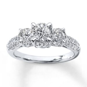 Representing your glowing past, present and future, this exquisite three-stone diamond ring will quickly become a cherished part of any jewelry collection. Additional round diamonds cascade down each side of the band. The ring, styled in 14K white gold, has a total diamond weight of 1 carat. Available online while supplies last.Treasures are not eligible for in-store pickup.Treasures may only be shipped either to your home address or to an alternate address.